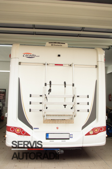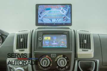 Pro instalaci parkovacího systému byl zákazníkem vybrán systém Garmin, majitel chtěl zachovat původní ovládání rádia, proto byl displej namontován na palubní desku. Vrchní montáž kamery byla zvolena kvůli lepší viditelnosti na nosič kol, přehlednosti a nižší míře zašpinění při jízdě za špatného počasí. Kamera má i funkci nočního vidění, takže v kempu snadno zaparkujete i při pozdním příjezdu. Displej je umístěn na napájeném magnetickém držáku, od obrazovky tedy nikde viditelně nevedou dráty a během vteřiny je možné jej sundat.